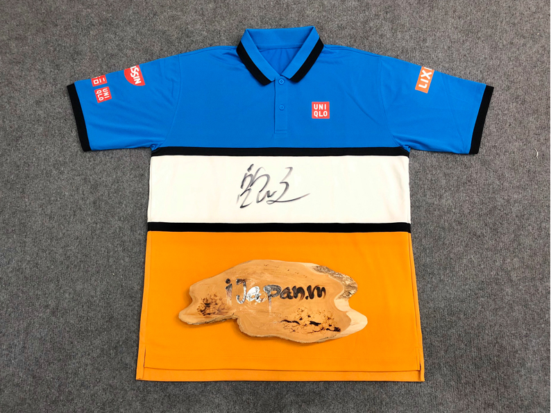 Áo tennis Nishikori bản chữ ký là sản phẩm được tay vợt người Nhật sử dụng thi đấu, áo được chính vận đông viên ký tặng khán giả. Đặc biệt chiếc áo được in logo các thương hiệu của nhà tài trợ mà bản thương mại không có. Sản phẩm được đấu giá tại Nhật.